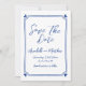 Enkel Handritad Whimsical Blå Bröllops-Spara Datum. Detta europeiskt inspirerade blå och vita Spara Datum-kort har en ren, minimalistisk design som är perfekt för par som söker tidlös elegans. En subtil handritad ram med charmiga blå hjärtan i varje hörn omsluter varsamt era bröllopsdetaljer, presenterade i en mix av script- och handskrivna typsnitt för ett utseende som känns både stilrent och personligt.
