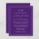 En enkel inbjudan till budgetbröllop med en modern utformning av eleganten med dina två brev monogram överst och dina detaljer omgivna av ett tunt gräns. All text är vit över en lila bakgrund. Färgen typsnitt och bakgrunden kan ändras till valfritt färg genom att klicka på knappen "anpassa". De här bröllopsinbjudningarna i billigt är underbara för ett minimalistiskt par.