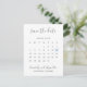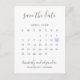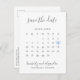 Modern "spara datum"-postkort med en enkel kalender i mjuk grå färg med orden "Spara datum" och era namn i ett elegant handskriftsliknande teckensnitt och ett pastellblått hjärta runt datumet, på vit bakgrund. Lägg till er returadress och ett personligt meddelande på baksidan. DESIGNTIP: För en kolumn som inte har något datum i första raden (vecka), lägg till ett mellanrum före den första siffran. Om ni behöver hjälp med att anpassa kalendern, tveka inte att höra av er till mig via knappen "kontakt".