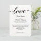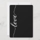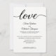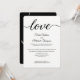 Enkel, modern, svart och vit typografi "Kärlek" kalligrafi manus. Anpassa denna bröllopsinbjudan med brudens och brudgummens namn och alla detaljer om bröllopet och mottagningen. Denna snygga och eleganta layout är enkel att anpassa.