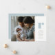 En enkel presentation för ditt nya lilla barn med ett foto, en stor blå initial, utrymme för statistik och föräldrar namn tillsammans med en prickig koordinerande baksida. Vill du ha en annan färg? Klicka på "anpassa" för att justera.