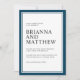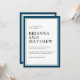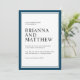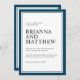 Den här moderna invigningsinbjudan har en marin blå dubbla gräns med vit centerbakgrund. Textparen är skarpa och elegant med tonvikt på namnen för bruden och brudgummen som visas i stor utskrift. Färg-systemet är ett fantastiskt val för kustlandskap i bröllop eller på destinationer och andra platser som valts ut. Det klassiska stil är alltid ett bra val under varje årstid.