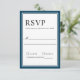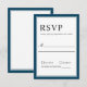 Den här moderna, klassiska bröllop-responskortsdesignen är enkel och smakfull och har en marin blå dubbla gräns med vit mittbakgrund. Textparen är skarpa och elegant med ett färg-system som är ett underbart val för bröllop eller destinationsbyggnader längs kusten och andra utvalda platser. Det klassiska stil är alltid ett bra val under varje årstid. Svarskortet finns också tillgängligt med måltider som gästerna kan välja önskade poster.