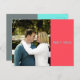 Detta Save the Date-kort är enkelt designat med korall-, teal- och gråa färgfält. Det har en bild på framsidan med namn tryckta över ett korallfärgat fält. Informationen finns på baksidan över ett grått fält. Teal- och gråa färgfält delar baksidan, med teal-text överst.