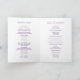 Enkelt uppfällt bröllopsprogram med en modern utformning av eleganten. Skyddet har dina två första monogram tillsammans med dina bröllop-detaljer i vitt över en lila bakgrund. Insidan har din bröllopsfest på den lämnat sidan och din ceremoni på högerna. Baksidan har ditt personliga tack till dig. All design inslag färg kan ändras i designredigeringsverktyget i verktyg. En chic och snyggt som är underbar för ett minimalistiskt par.