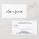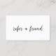 Modern referenskort med en enkel och minimal svartvit design med "hänvisa till en vän" i ett skript för elegant. På baksidan finns dina medieikoner och kontaktinformation för social. Du kan ta bort ändringar, lägga till eller ta bort ikonerna i verktyg för designredigering. Dessa minimikort för remittering är underbara för alla företag.