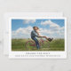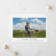 Ett minimalistiskt bildskärmskort för uppskjutning av Bröllop med vågrät bild och ord, "Ändra datum" tillsammans med en textrad i ett serieteckensnitt. På baksidan finns all uppdaterad information svart över en vit bakgrund. En chic och modern utformning för att meddela att bröllop har skjutits upp.
