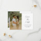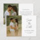 Det här enkla minimalistiska fotobryllopet sparar datum-meddelandet med handskriven vit text, minimala anpassningsbara textdetaljer och foto på framsidan. Baksidan har plats för ett extra foto och detaljer som en bröllopswebbplats. Klicka på redigeringsknappen för att anpassa designen efter dina behov.