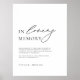 Minns och hedra nära och kära som har gått bort på din speciella dag med denna vackra bröllopsskylt med texten "In Loving Memory OF". Med en enkel och elegant design och en ren och stilren font är denna skylt det perfekta tillskottet till varje bröllopsceremoni eller -fest. Den minimalistiska designen passar väl in i alla bröllopsdekorationer och skylten kan anpassas. För att anpassa, klicka helt enkelt på " Anpassa" och ange dina uppgifter. Denna skylt är ett underbart sätt att hålla minnet av dina nära och kära nära på din speciella dag. Ta en titt på resten av kollektionen för att se alla matchande föremål som finns i denna vackra design.