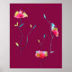 Abstrakt rosa blomsterdesign inspirerad av japansk konst. Denna rosa blommiga design på vinburgunder bakgrund med blå blå knoppar är enkel och modern ren estetik.