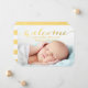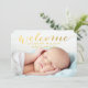 Ett enkelt modernt Baby-födelsekort för födelseinformation | Välkomstskript för guldblomma. Elke Clarke Design ©. Mer stilar finns i vår butik. Guldfolie (tryckt fotoeffekt) typografi överlägg med ord "Välkommen" i ett handskriftsteckensnitt. Enkel, elegant och mångsidig design som du kan anpassa. Guld och vit rand eller linjer mönster på baksidan.