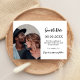 Ett foto Spara datumkortet för bröllop. På framsidan: Lägg till ett eget storlekt foto för lodrät. En vit chic, svart text. Mallar för namn och datum. Namn och texten: Spara datumet är skrivna med ett modernt handskript i stil. Tillbaka: Du kan lägga till mer text om du vill. Gå in i designen verktyg och lägg till på baksidan av lagrar.