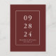 Detta moderna postkort från trendig bröllop spara datum är enkelt och ekonomiskt och förmedlar era bröllop-planer i contemporary minimalistiskt stil. Provdatumet på kortets framsida är i stor utskrift som presenteras vertikalt för islagsresultat. Bakgrunden färg i rik burgundy vin red kan beställas som den är eller så kan du välja en annan bakgrund i färg om du vill ändra färg. Om du vill ändra färg markerar du "anpassa ytterligare" så visas de bakgrundsalternativ som du vill välja mellan i färg. Anpassa texten på framsidan och baksidan av detta kort med information om bröllop. Detta program i färg är ett fantastiskt val för höst- och höstbröllop.
