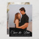 Den enkla och klassiska, moderna tvåfotsskripttextens kalligrafi "Spara datum" med en grund-böjd panel som smickrar fotot på framsidan och två halvogenomskinliga paneler för att stänga av bakfotonet så att texten markeras på baksidan. Lägg bara till foton och information som ska slutföras. Sammansatt design efter Helgdag Hearts Designer med platshållarfoton med benägenhet Unsplash.