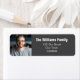 Moderna adressetiketter med din examina foto och familjens adressinformation i vit text på en kolgrå bakgrund. Designad av Thisisnotme