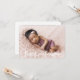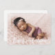 Ett enkelt modernt födelsemeddelande med baby namn i vit text på framsidan och födelseinformationsmeddelandet på baksidan.