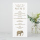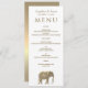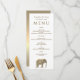 Enkel, elegant, minimalistisk meny för vitt bröllop i kombination med guld-folie för monogram elefant - symbol för kärlek, fertilitet och lycka till. Snyggt, finare, unik, för brud med modern, sofistikerad smak.
