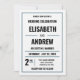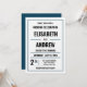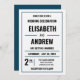 Enkel, modern bröllopsinbjudan från bröllop. Fet, svart och vitt. Blå gräns-accenter och baksidan av inbjudan.
