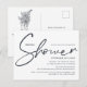 Enkel och elegant bröllopsdusch vykort med stor kalligrafi "dusch" i djupblått med modern typografi. På andra sidan kan du lägga till ytterligare text eller ta bort. Vildblommor i murarburk.