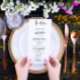 Det här menykortet är designat för att komplettera alla bröllop-teman eller dekortecken och har en ren och minimalistisk layout som är adsorterad med klassisk skripttypografi för ett litet förfiningssteg.