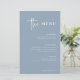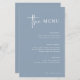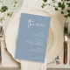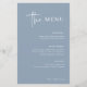 Denna eleganta, dammiga blå bröllopsmeny är enkel och minimalistisk men ändå mycket stilren tack vare den vita moderna handskrivna stilen och det rena upplägget.