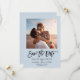 Minimalistisk modern spara datum-anmälan med trendig borstskrift handskrivna typografi på dammig blå med ditt personliga foto bredvid dina namn och datum för bröllopet.