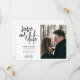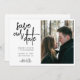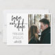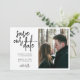 Minimalistiskt foto av förlovning bröllop spara datum i svart och klarvitt med ett modernt, handskrivet kalligrafiskript. (++++++++++) Lämpligt för hösthöstfall i vår eller vintertid snyggt modernt tema bröllop.