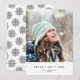 Det här julkortet har en minimalistisk vit bakgrund med enkel svart typografi som hälsar med "fred glädje kärlek". All text, inklusive hälsningen, kan anpassas. Baksidan av kortet har ett enkelt, modernt snöflingemönster i svart och vitt. Designen rymmer ett foto och fungerar bra i färg eller svartvitt. Designtips: Du kan lägga till ett till foto eller mer text på baksidan.