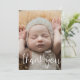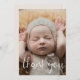 Skicka ett speciellt tack till familj och vänner med det här födelsepromemorian Fotokort. Den enkla designen har ett foto på framsidan med Tack i en skripttypografi.. Baksidan innehåller alla viktiga detaljer som baby namn, födelsedatum, födelsestatus och ett tackmeddelande från föräldrarna.