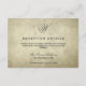 Detta receptionskort har en vintage look, dess papper är tryckt för att se blekt och fläckigt ut. Eleganta typsnitt och en enkel monogram.