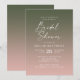 Enkel Monstera Grönt & Rosa Ombre Inbjudningskort för möhippa. Den här moderna minimidesignen för Shower inbjudan är enkel klassisk och elegant med en subtil toning för flera toningar och en söt namnteckning skriptkalligrafteckensnitt med svan. Visas i Monstera Grönt & Rosa Colorway. Finns i flera alternativ för färg eller kan redigera färger i redigeraren (klicka på anpassa ytterligare medan du anpassar) Om du vill se mer söker du efter Chic Paperies samlingar från 2022 bröllop för att se allt om trenddesign och bröllop färger för detta år.