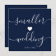 Detta är ett enkelt mörkblått och vitt skript för mindre bröllopskort för att informera dina gäster om att ni har beslutat att minska er bröllopsfest, ha en mindre bröllopsfest, mikrobröllop, intimt bröllop på grund av vissa omständigheter.