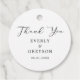 Enkelt och elegant bröllop-favärde-tagg med ett handskript som säger "tack" överst med bruden och rummets namn.