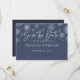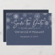Det minsta mörk blått sparandet av datumkortet är perfekt för det kommande vintertemat bröllop, designat med snöflingor, en vintage med texturerad bakgrund och ett vanligt vitt handskrivet bokstäver. Du kan anpassa framsidan med datum för namn och bröllop samt baksidan med ytterligare information.