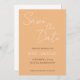 Enkla bröllopsinbjudningar med spara-datum som har vit, stiliserad text på en trendig, persikofärgad bakgrund. Redigera och ersätt namn, datum och plats med dina egna. Välj storlek på inbjudan och pappersstil.