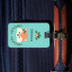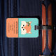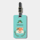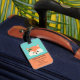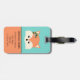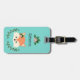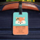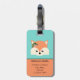 Bedårande bagagetikett med ansiktet på en bedårande seriefigur räv. Hon har rosa blommor och gröna höstblad på huvudet under vänster öra. Ovanför räven finns en mall för att anpassa. Designen är inramad med fler rosa blommor och gröna blad och bakgrunden är en nyans av teal.