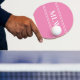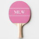 Den här rosa pingpongpaddeln har tre vita brev i mitten. Du kan ändra brev till visning av rätt monogram. Två vita vågräna linjer ligger över och under initialer.