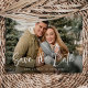 Det här enkla och snyggt bröllop spara datum-kortet innehåller ditt favoritfoto på framsidan, med ett elegant, vitt handskript. Kortets baksida har plats för ett annat foto, plus utrymme för mer information om bröllop. En elegant som är perfekten för att informera familj och vänner om ditt kommande bröllop!