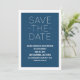 Enkel Save the Date-annonsering i mörkblått och vitt med en modern typsnittsdesign. Denna trendiga och chic save the date-inbjudan är enkel att anpassa med dina bröllopsdetaljer. För fler anpassningsalternativ, klicka på knappen Anpassa.