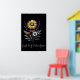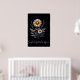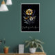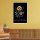 Den här poster blommigten har en slående arrangemang inställning mot en djup svart bakgrund som skapar en dramatisk kontrast som får blommorna att se ljusa ut. Mittstycket är en stor daisy-lik blomma med roterande vita och gyllene orangar runt en texturerad gult. Under är det en mindre ren vit daisy med en gult. I den arrangemanga finns långa lila lavender-stjälkar på vardera sidan, med höjdtillägg och ett kontrasterande färg. Mindre guldkalender eller guldblommor tillför ytterligare blad av pulserande gult-orange under hela sammansättningen. Blommorna åtföljs av en detaljerad silvery-grått-löv och små vita accentblommor som liknar drottning Anne's snöre.
