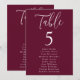 Modern bröllopssittplatskarta med "Bord" visat i en vit skrift med bordnumret och gästernas namn visade nedan på en burgunderbakgrund. Designen upprepas på baksidan. För att beställa sittplatskartan, redigera varje kort med bordnumret och gästernas namn och lägg till det i din varukorg. Utformad för att samordna med vår Enkel Skript bröllopssamling.