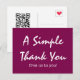 Om du letar efter ett vackert, enkelt och elegant vykort för att tacka kunder för deras affärer eller fortsatta stöd, kanske du uppskattar detta enkla vykort med vinfärgad text och QR-kod från Zazzle! Detta stilfulla vykort har en QR-kod och text som enkelt kan anpassas för att möta dina kundservicens behov. Finns i matt eller halvblank papperskvalitet. Säljs med eller utan kuvert, enstaka eller i mängder om 2-2000. Ljust linjerat och hjärtstämplat på baksidan för en extra touch av kärlek och för din adresskrivning. Perfekt som gåva under dagliga kundinteraktioner, som följer med beställningar eller som present vid fester eller speciella evenemang. Spara när du köper mer - inga minimikrav! 100% nöjd