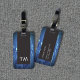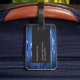 Elegant anpassningsbar bagagetagg med en professionell studiofotografi av blå kretskort, svart rand och monogram.