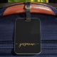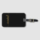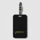 Feminint Minimalistiskt Enkelt Rent Svart och Guld Monogram Namn Signatur Skript Anpassad Personlig Väska Bagage Tag. Denna design med ditt förnamn i en snygg handstils-svans kalligrafisk teckensnitt signatur (eller typografi) i guld på svart bakgrund. Lätt att anpassa. Stilsäker feminint present för bröllop, brud shower, examen, 16-årsdag och för alla som älskar glamourös stil.