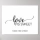 Denna enkla svarta kalligrafiska skylten med texten "love is sweet" är perfekt för ett rustikt eller modernt bröllop. Den minimalistiska designen har en elegant penselskrift och ett vackert feminint hjärta.