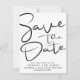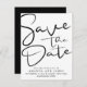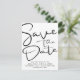 Spara datumkortet genom att enkelt spara det svarta och vita Bröllop. Utforma funktioner för "Spara datumet" i modernt handskrivet teckensnitt och dina detaljer om vit bakgrund. Kortets baksida är djupt svart och det finns en ruta för ytterligare information, t.ex. webbplats adress osv.