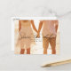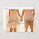 Denna minimalistiska fotosparande datum kortsida har en avslappnad text och ett stort foto. På framsidan av vykortet står "Spara datumet" skrivet med svart kalligrafi. Paret namn är placerat ovanför texten och datum och plats för bröllopet är skrivet under texten. Den svarta texten ligger överst på ett horisontellt foto (liggande orientering) som sträcker sig till kanterna. Ytterligare information om bröllopet (inklusive brölloppswebbsidan) kan läggas till på baksidan av vykortet.