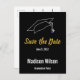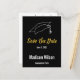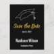 'Spara datum' för en examensfest med detta svarta, vita och falska (inte folie) guld vykort. Du kan anpassa det med examen kandidatens namn och festdatum. En examenshatt finns högst upp ovanför texten på detta svarta vykort.