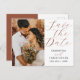 Elegant spara datum-anmälan är perfekt för att få dina bröllopsplaner i rörelse. Den har en fotomall och stor 'spara datum'-typografi i terracotta på en vit bakgrund. Anpassa med dina egna detaljer.