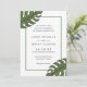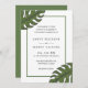 Modern bröllopsinbjudan med en enkel design med två stora handflatan-löv i grönt, en i det övre lämnat hörnet och en i det nedre hörnet av högerna och en ram som omger dina bröllop-detaljer, över en vit bakgrund. Baksidan är en matchande skugga av grönt. Den här tropiska designen är perfekt för ett sommarmålbröllop på stranden.